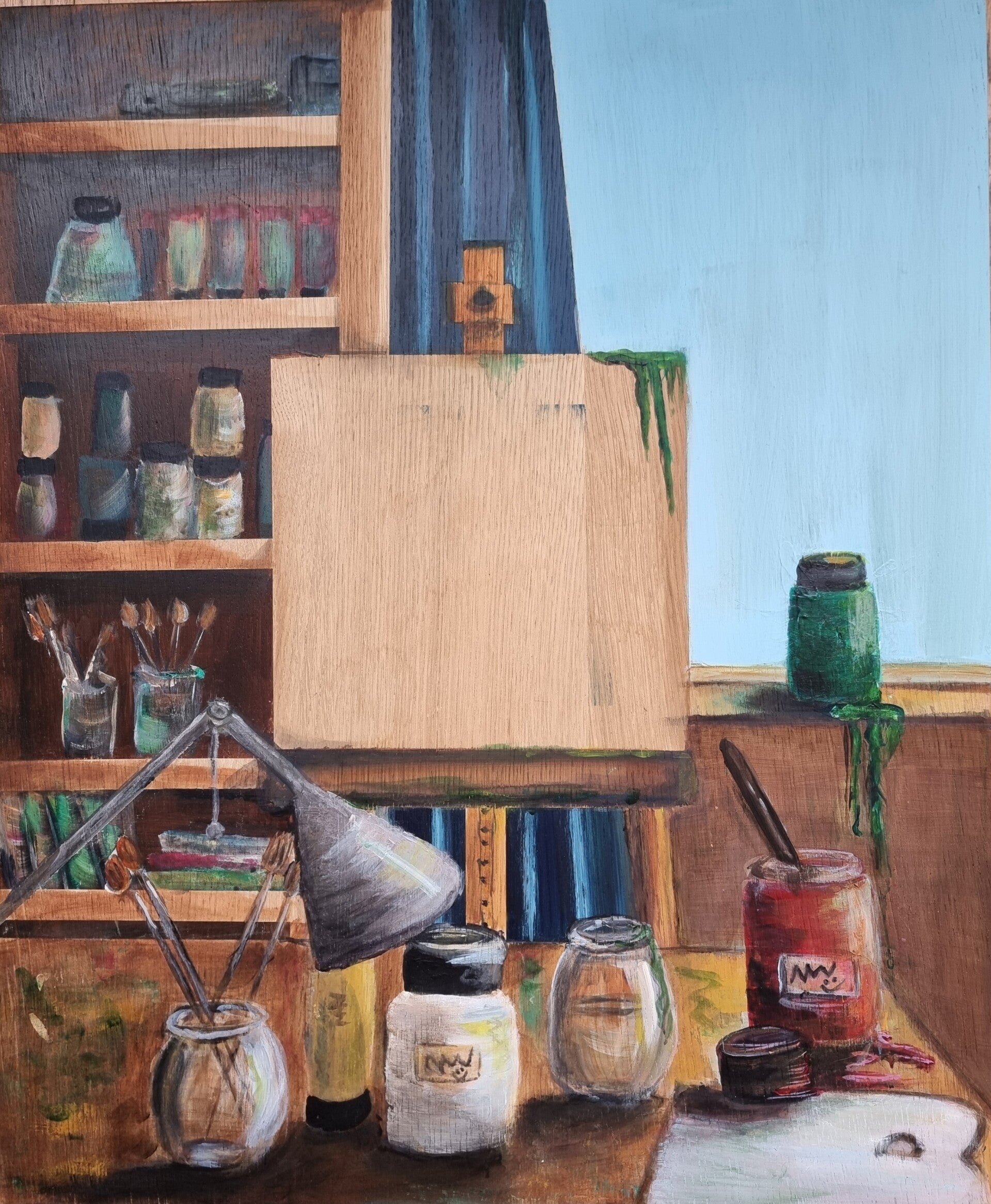 - MIjn Atelier. op zware houten plank. 50x60 (26.3)